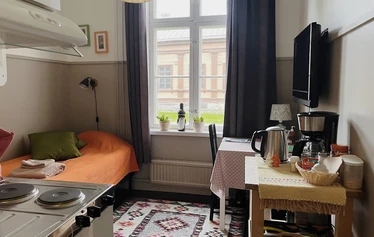В нашем отеле есть одноместный номер специально для тех, кто путешествует в одиночку. Это небольшая комната площадью 11 м2 со своим душем и туалетом. Здесь, как и во всех остальных номерах отеля, есть собственная мини-кухня с электрической плитой, микроволновой печью, кофеваркой, чайником, тостером и набором посуды. Здесь вы сможете приготовить себе не только чай или кофе, но и полноценный ужин.